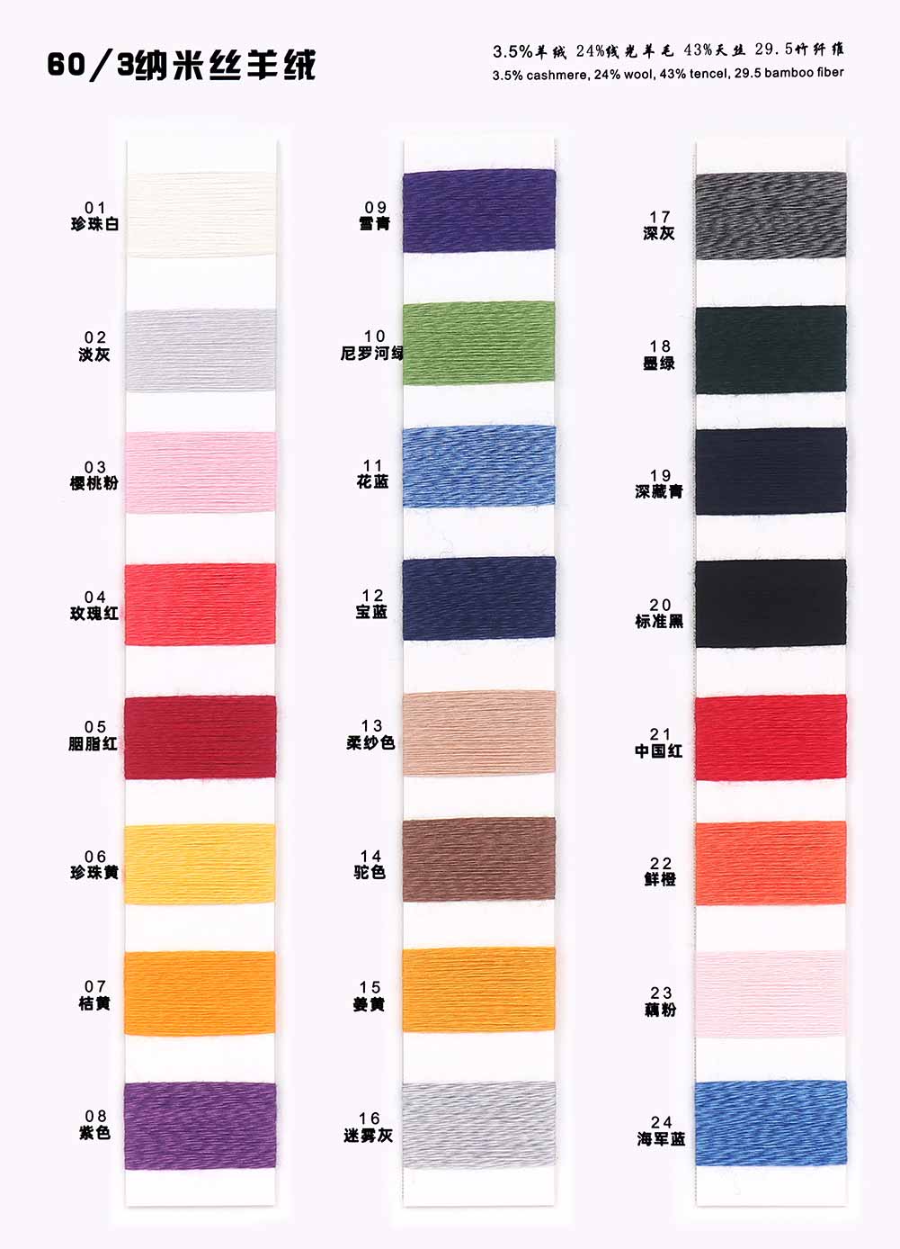 3.5%羊绒Cashmere 24%线光羊毛Wool 43%天丝Tencel 29.5%竹纤维Bamboo fiber