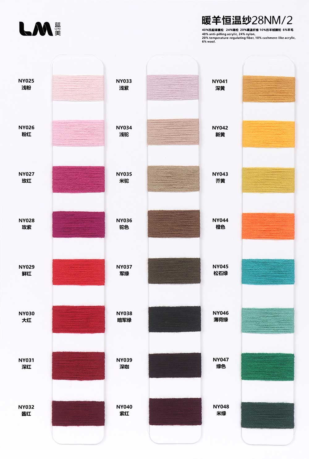 20%调温纤维Temperature-regulating fiber 26%抗起球腈纶Anti-pilling Acrylic 26%腈纶Acrylic 20%锦纶Nylon 8%羊毛Wool